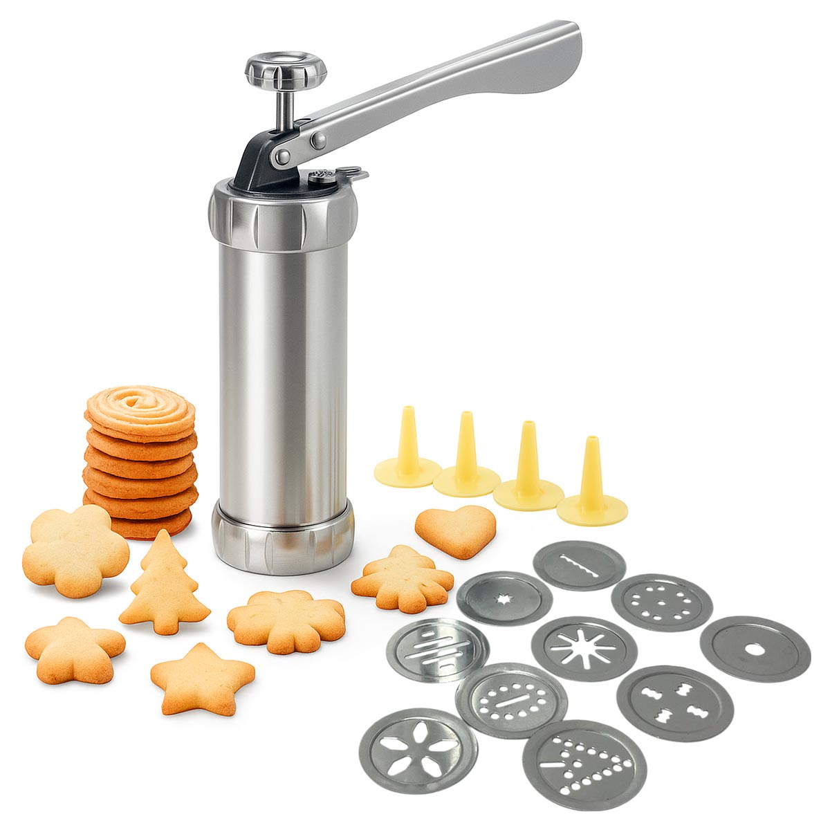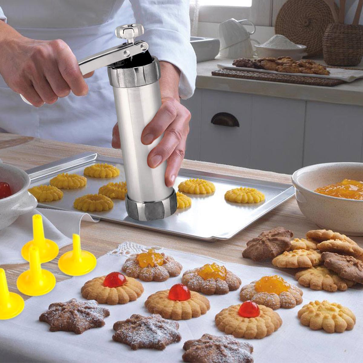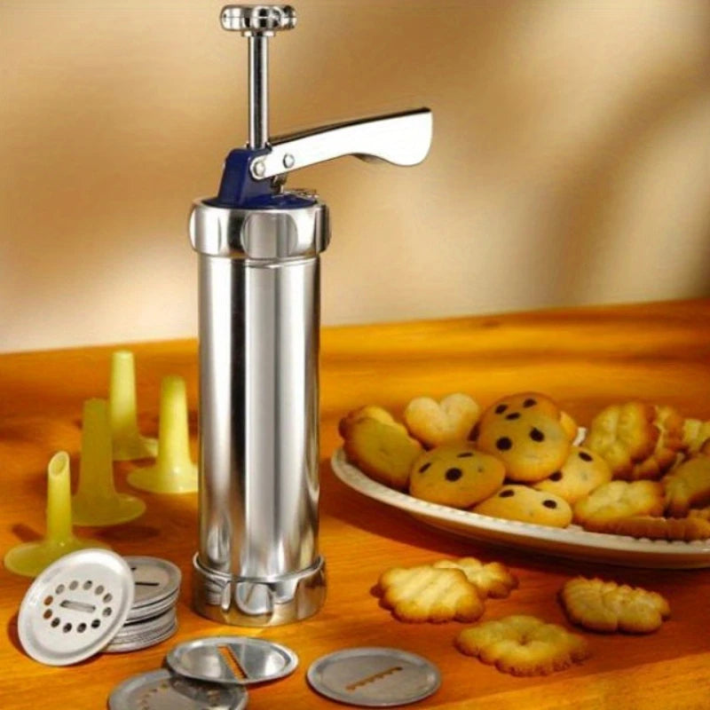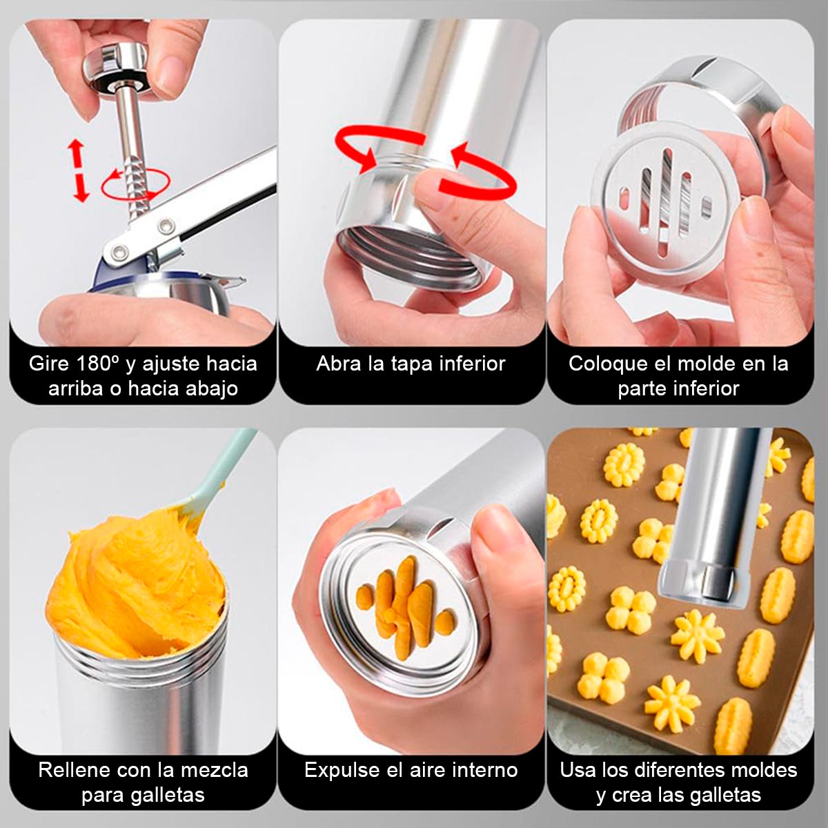 Incluye discos de acero inoxidable con formas variadas para hacer galletas decorativas y boquillas intercambiables para decorar con crema, glaseado o chocolate.