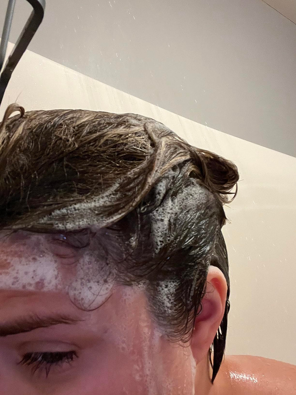 -Masajea suavemente con las yemas de los dedos, distribuyendo la espuma por todo el cabello."